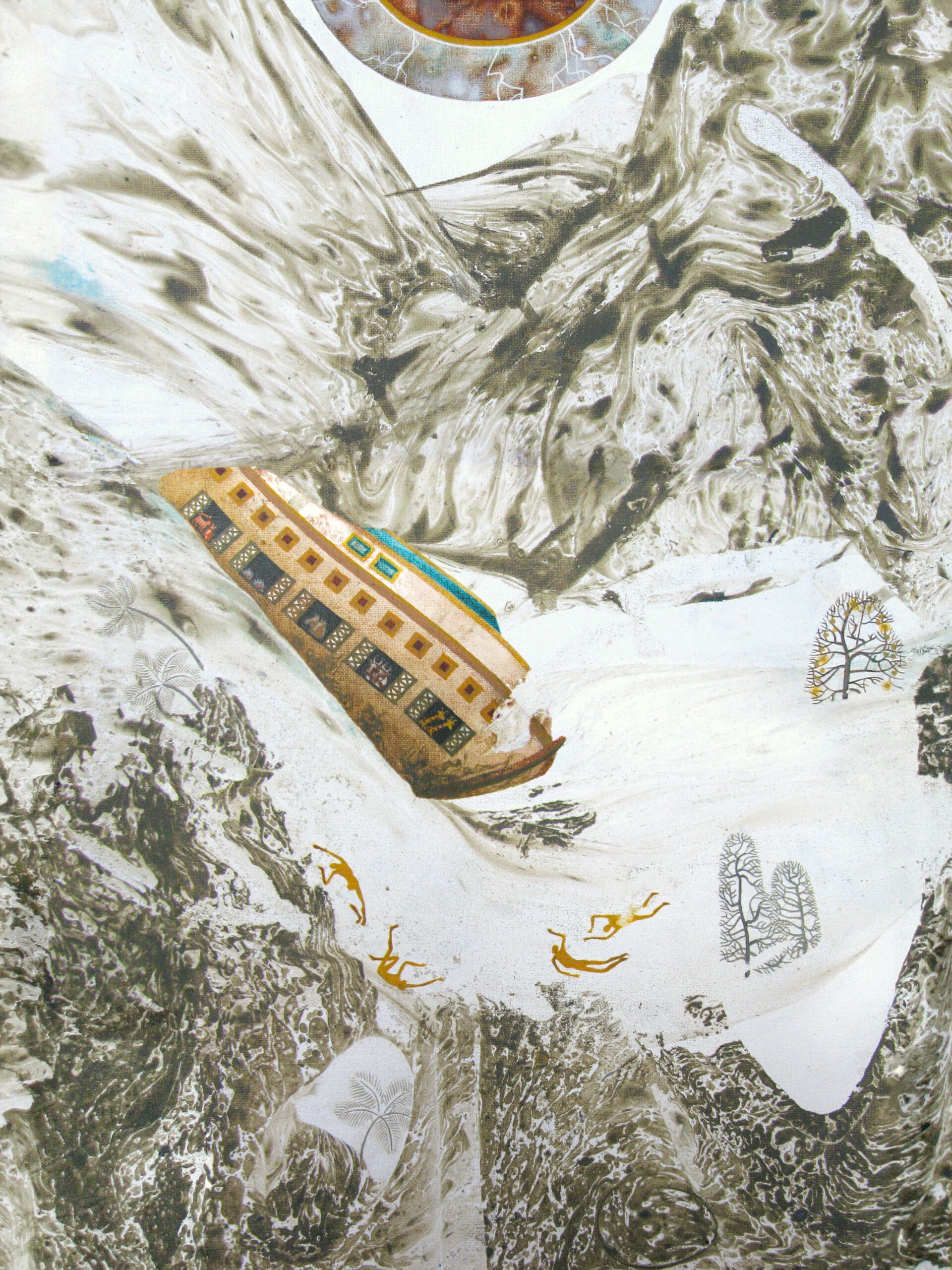 Second, children’s versions of the story regularly forget the people who die in the flood—or that people die in the flood at all. Genesis 7, on the contrary, is quite concerned with the dead. Seven verses catalogue the systematic destruction: The waters swell. The mountains are subsumed. All flesh dies in the order it was created. Creation is coming undone—first the birds, then the domestic animals, then the wild animals, then the swarmers, and then the human beings. Then, not to put too fine a point on it, the text records their dying again, this time in the inverse order of their creation—first the human beings, then the animals, then the creepers, then the birds. These verses together work a tight chiasm of death—creation is dead coming, dead going. The death is spun up and then unspools, threading the waters of the flood.