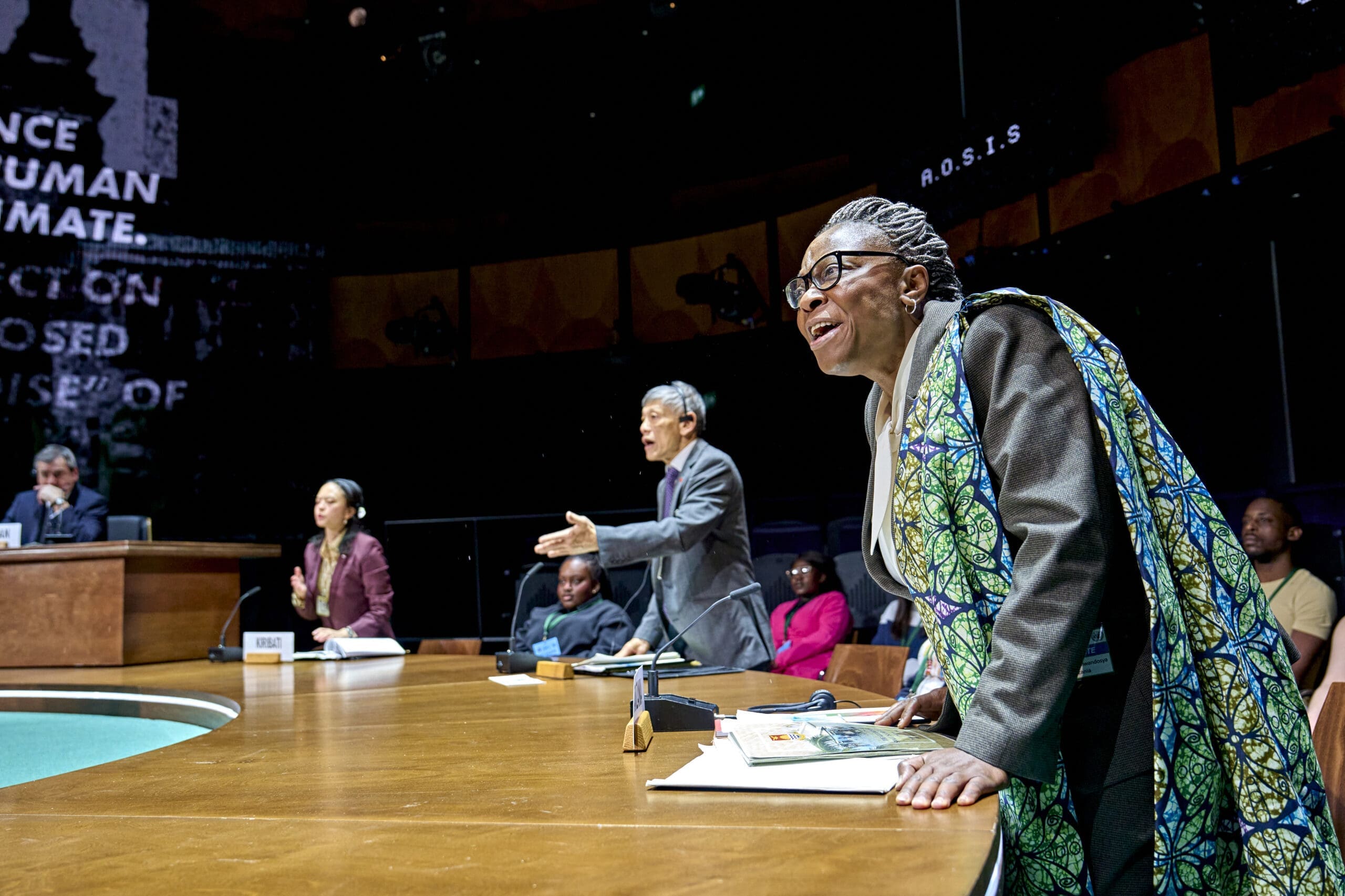 The play’s text oscillates between satire and solemnity, moving like a fugue with counterpoint and echo. Dialogue rises into moments of incantation. Lines repeat. Motions are passed and revised. Acronyms—COP (Conference of the Parties), IPCC (Intergovernmental Panel on Climate Change), AOSIS (the Alliance of Small Island States)—fly like ash. And then—suddenly—an interruption: The chairman takes a nap. A childhood memory surfaces. Someone hums.