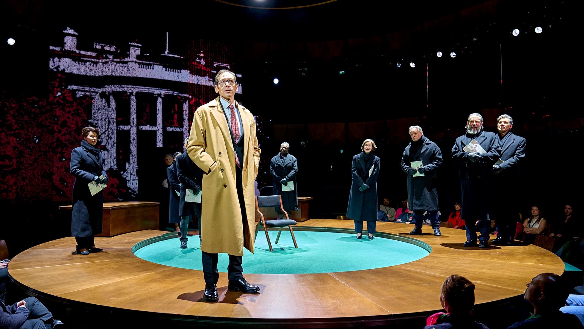 The precarious hope is given form through the staging itself. Performed in a roundabout theatre—a space where the stage is surrounded by the audience on all sides—Kyoto unfolds as a kind of embodied negotiation. The actors move in concentric motion, circling one another without any single figure in command of the whole. This spatial form resists the hierarchy of a proscenium stage; it invites intimacy, disorientation, and mutual vulnerability. The action is distributed among several vantage points, woven into the eyes and breath of the audience. One becomes aware, viscerally, of the nearness of the other. The centre does not hold—and that is the point.