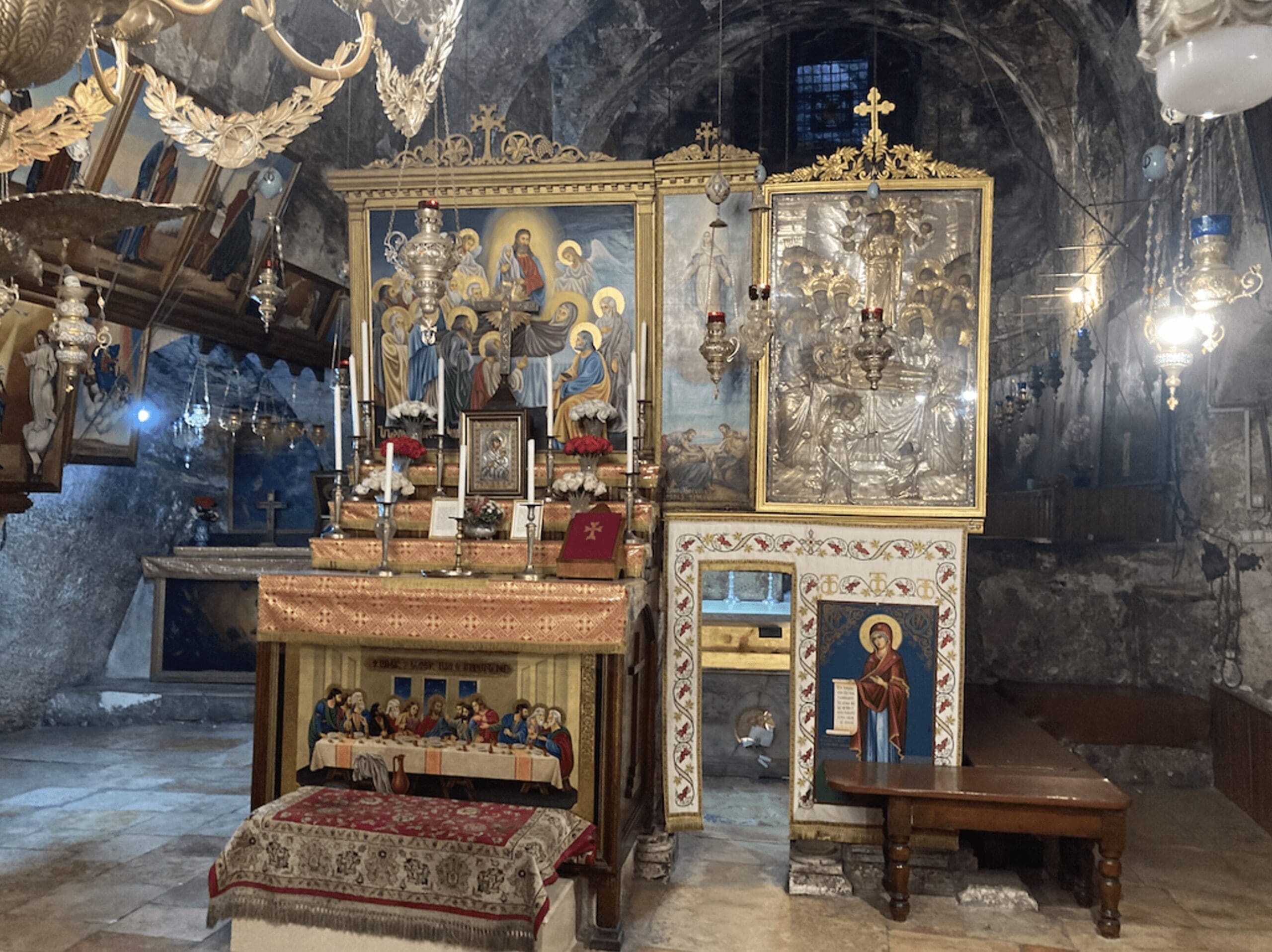 Mary’s tomb—empty owing to the tradition of her body’s assumption into heaven—is behind a cluster of tacky gilded paintings of the funeral itself, with a bad copy of Leonardo’s Last Supper thrown in to ward off the art snobs. In the iconography for this event, known in the East as the Dormition (falling asleep) of the Theotokos (Mother of God), Mary’s carrying of the infant Christ is reversed, as son carries mother instead. (I expect anyone who has had to care for aging parents, or who has witnessed them die, can especially relate.) If Mary’s soul is tiny in depictions of this occasion, the door to the tomb itself is deliberately tiny as well.