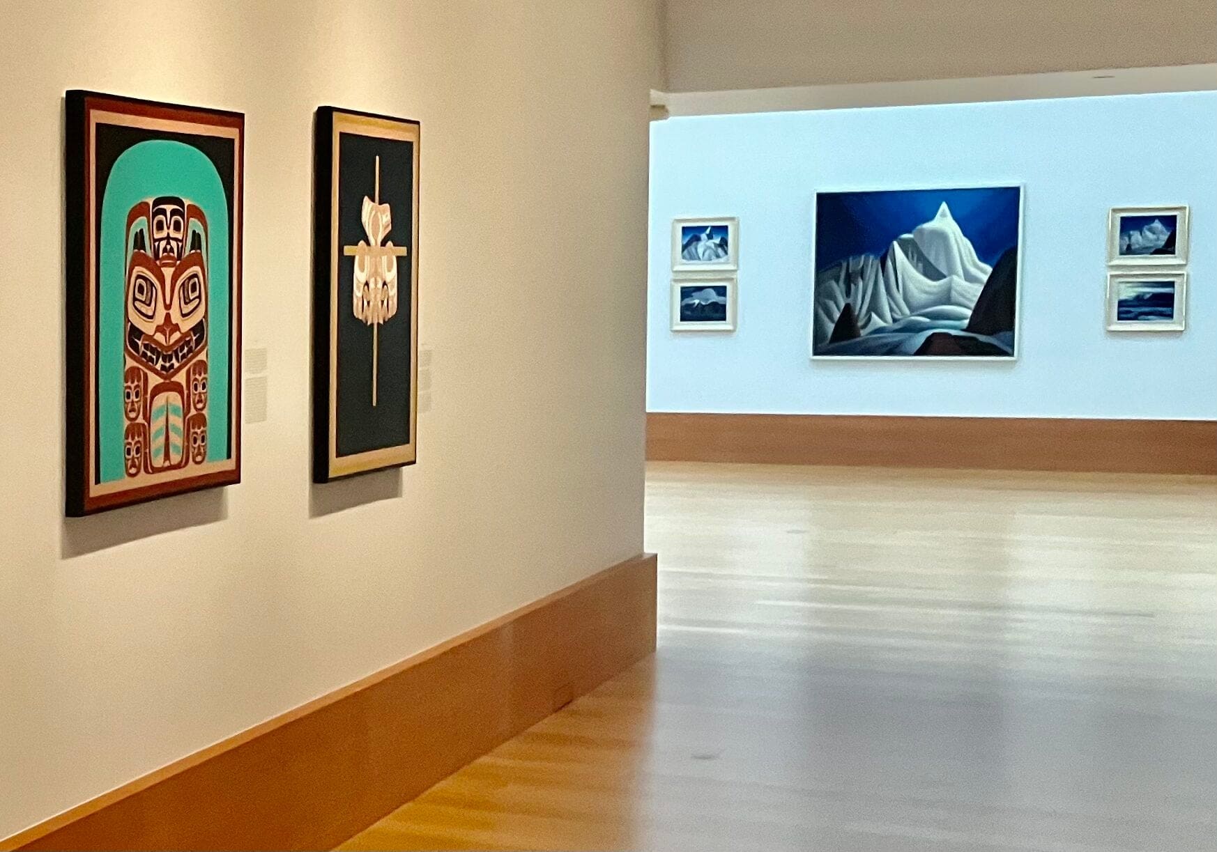 Despite their religious differences, Carr and Harris stayed in contact. Unlike most viewers today, Carr appreciated Harris’s later abstract work, and Harris was especially fond of Carr’s 1929 painting titled Indian Church, which hangs—now renamed Church in Yuquot Village—in Toronto today. Carr knew of Indigenous life thanks to her sister’s missionary work among the Indigenous communities of Vancouver Island. The artist’s 1941 book Klee Wyck (which was Carr’s native name) made a case for Indigenous dignity long before it was a fashionable thing to do. Indian Church is not—as sluggish viewers might assume—just a white church in front of a dramatic Northwestern landscape. It is a church (like the church today) that is desperately in need of the colour of the life around it, and a church that—if you look closely enough—is in the process of receiving it. When the Kwakwaka’wakw artist Sonny Assu “invaded” Carr’s paintings with Northwest Coast design tags, his aim was not to disrespect her but to call attention to the Indigenous elements that Carr’s contemporary viewers too easily miss.