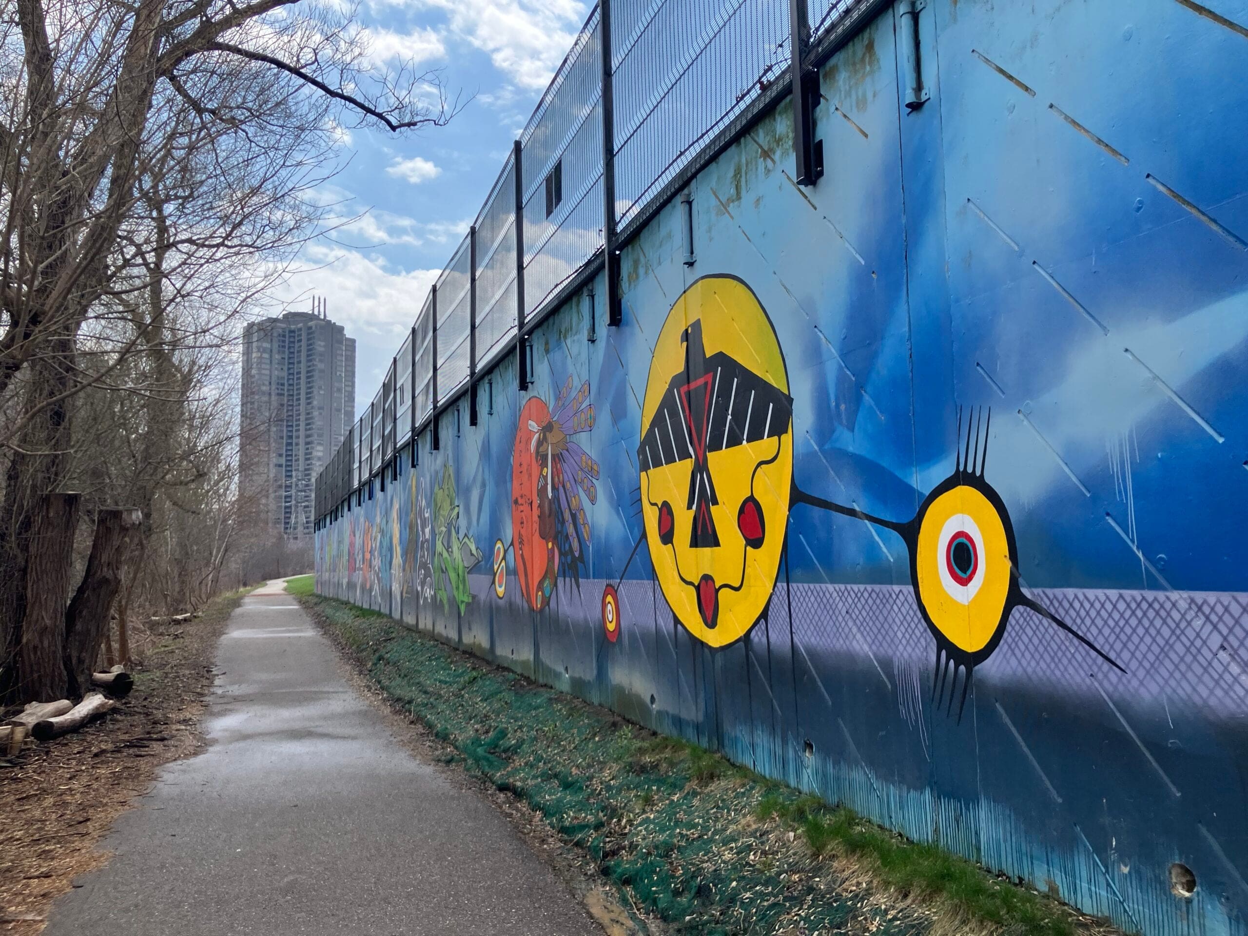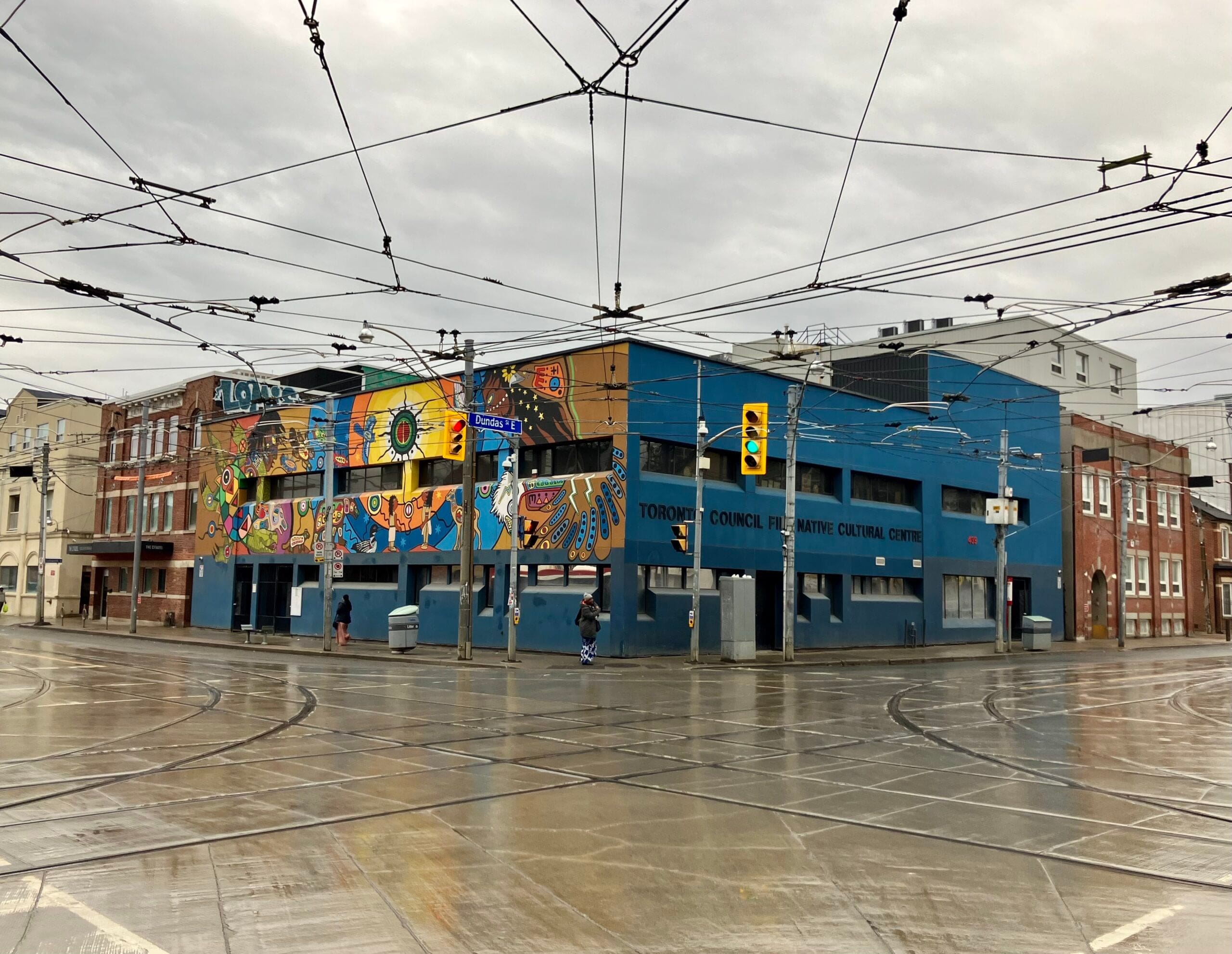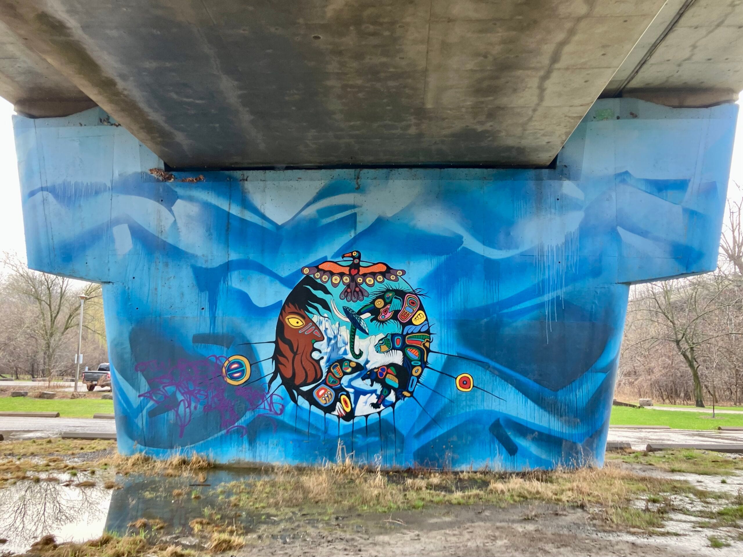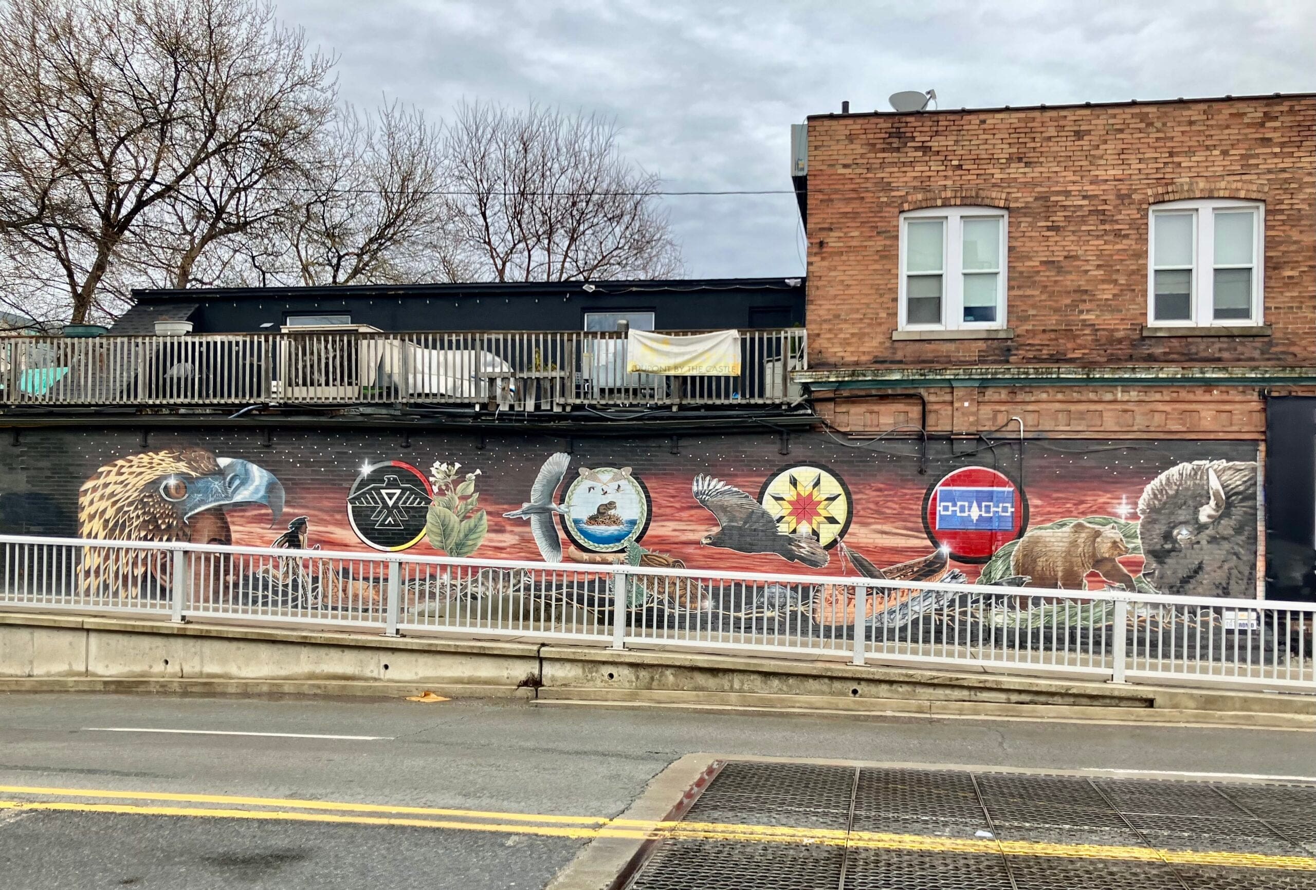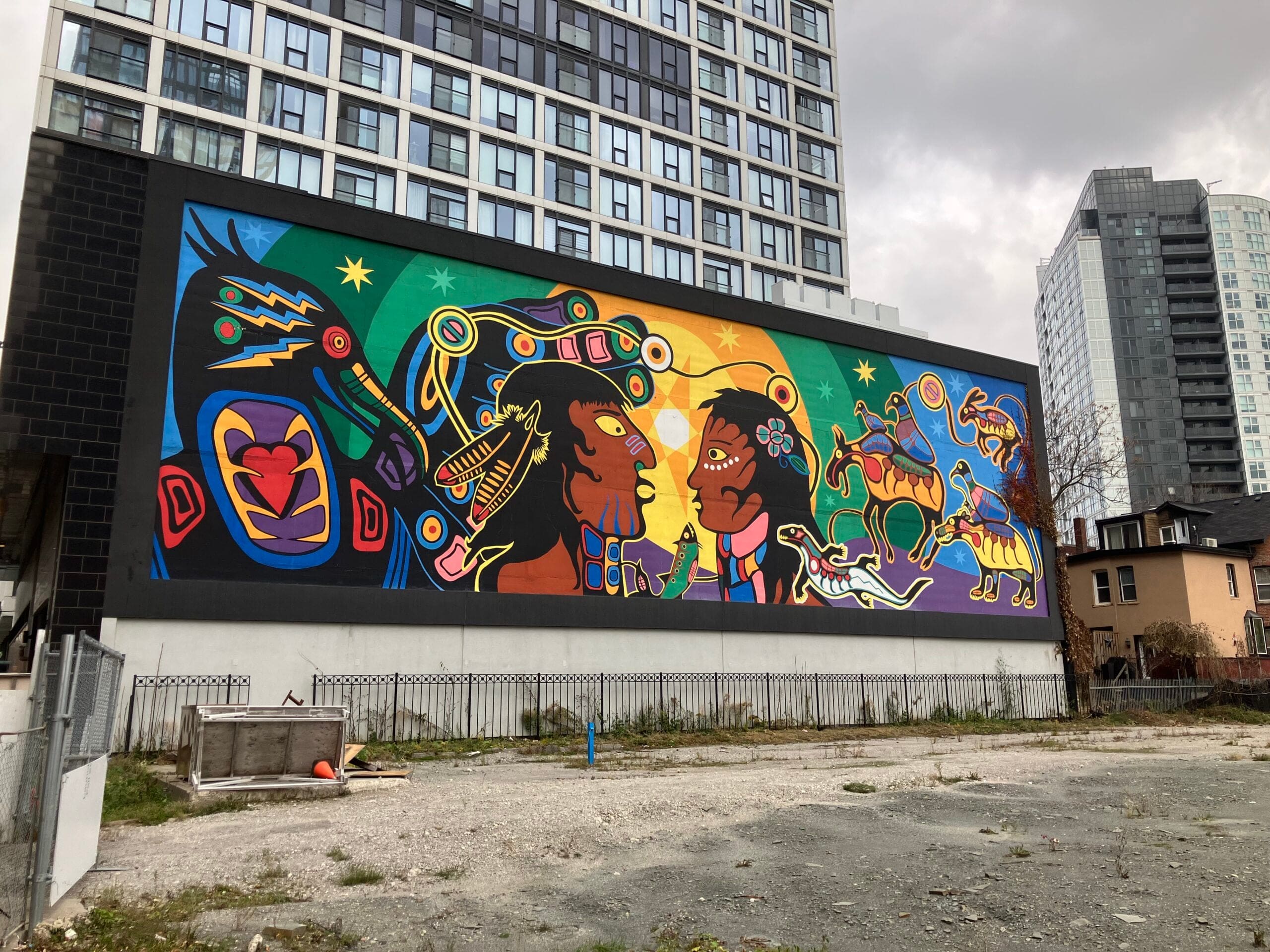 But these intersections have not stayed put in the safe confines of Toronto museums. What began for me as hunting down Group of Seven paintings has become a conversation with living artists. It was as if the city of Toronto were asking me, as the angel asked Mary Magdalene, “Why do you seek the living among the dead?” What I have elsewhere called the “Turtle Island Renaissance” is in full flower in the wider city today. Train underpasses, bare concrete walls, and city buildings have been freshly clothed with murals that rival those in any major city in the world. These paintings are not in the style of the Group of Seven. On the contrary, they are in the spirit of Luke Parnell, though obviously expressing more the region’s Ojibwe past than the style of the West Cost. These paintings tell the full story of the Great Lake area’s human habitation, from the Ice Runners that hunted along the borders of glaciers, to the Huron-Wendat, Haudenosaunee, and Anishinaabe, as well as settlers who came later. And yet one of these paintings that emblazons a Toronto high rise, titled The Original Family, transcends ethnic division, perhaps testifying to the collective ancestry of the human race. We might call this mural Toronto’s Adam and Eve.