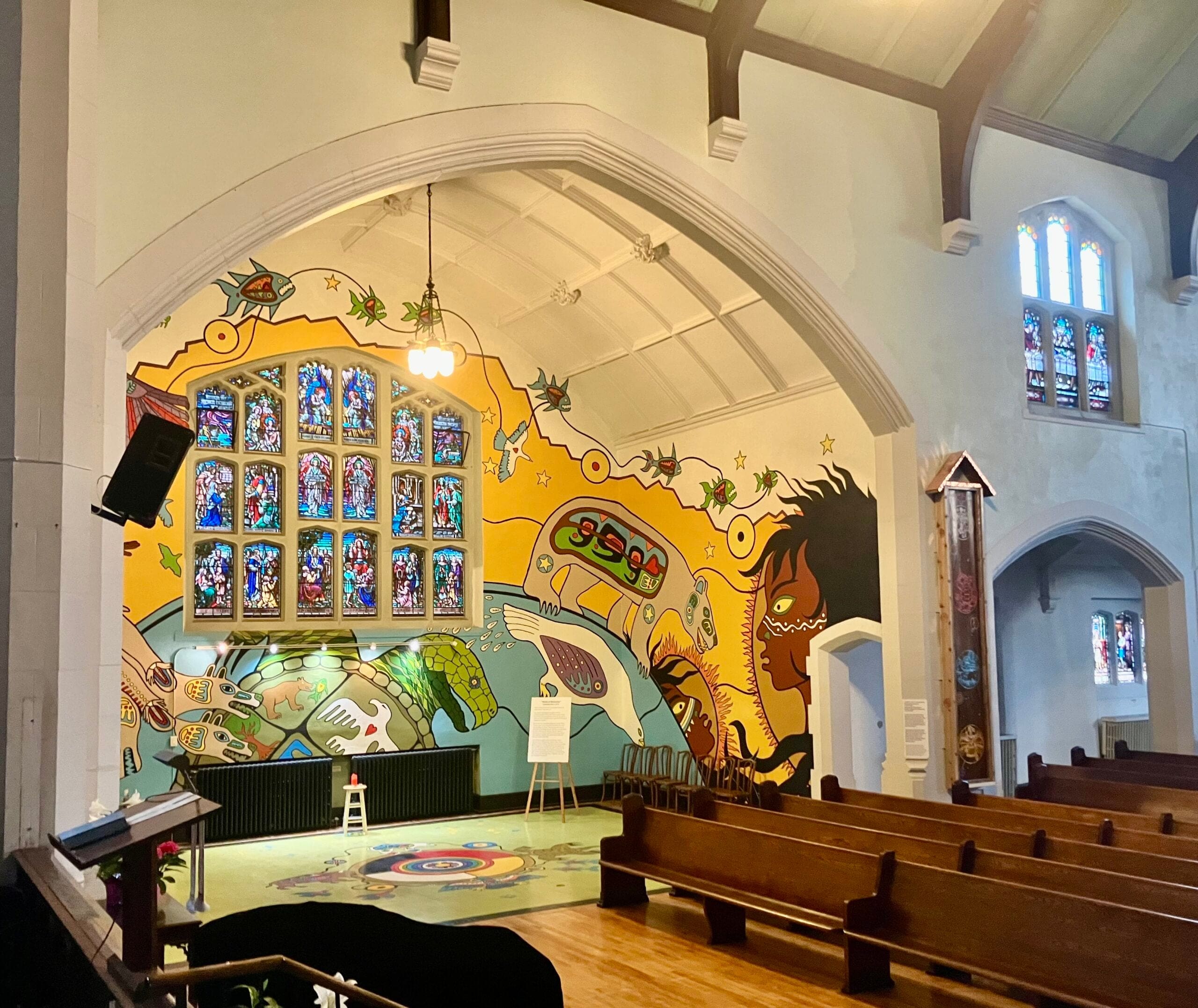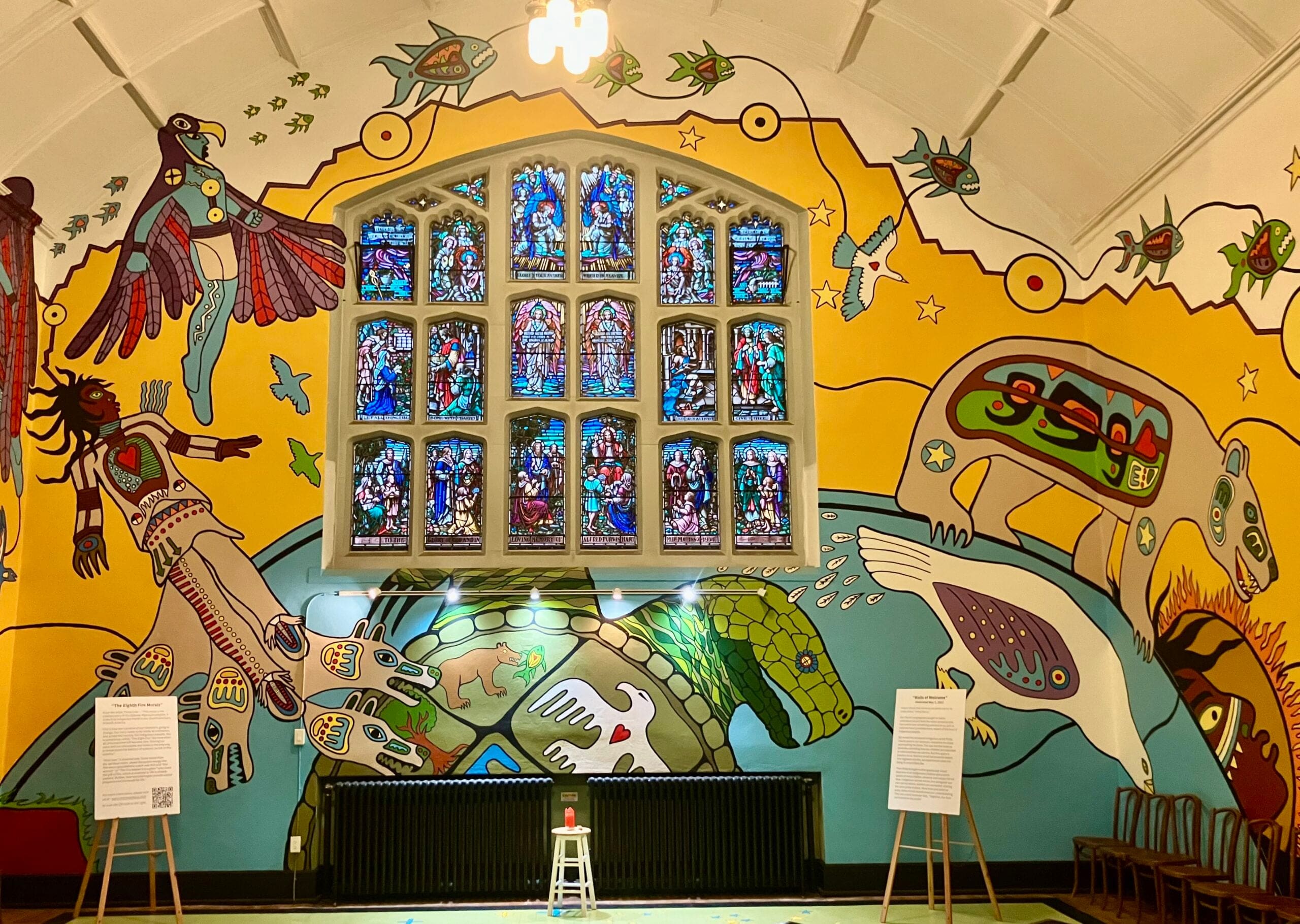 But the publications that rightly celebrate this remarkable effulgence frequently fail to point out that this style enhances churches as much as it enhances museums. Just as the Group of Seven aesthetic found its way into (now destroyed) churches, Cote’s murals have as well. No account of these recent achievements is complete without commentary on the painting that fills the south transept of Roncesvalles United Church in the Woodland style, or the Renaissance–style enhancing of the Chapel Royal at Massey College. In the former, Cote saw no need to bash out beautiful stained–glass windows that celebrate the Beatitudes, for he well knows the compatibility of Ojibwe and Christian thought. The Seven Grandfather Teachings graft perfectly onto the seven gifts of the Spirit from Isaiah 11:2–3. Teachings of the dark abyss of God that Cote received from his Ojibwe elders are a fitting match to the divine abyss in the book of Genesis, a bright abyss that links humans and creatures together through dark power lines of love.